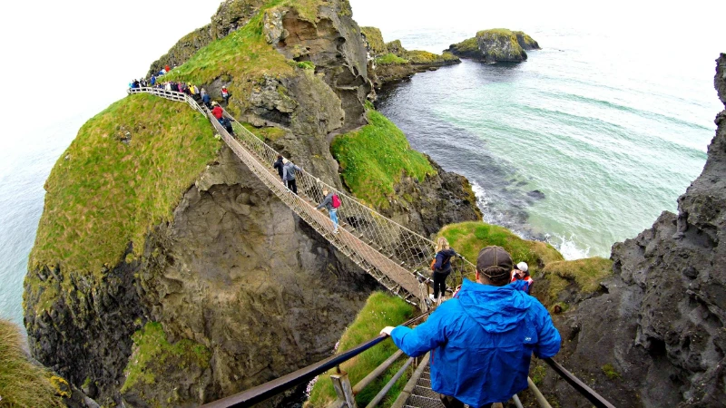 Linking the mainland to Carrickarede Island, this rope bridge has been thrilling visitors for over 350 years. Originally built by fishermen, it now offers everyone a chance to cross 30 meters above rugged coastal rocks. The Atlantic wind gives the bridge a lively sway, enhancing the thrill. Below, sea caves host seals and seabirds. On calm days, the views of the coast and ocean are simply spectacular.