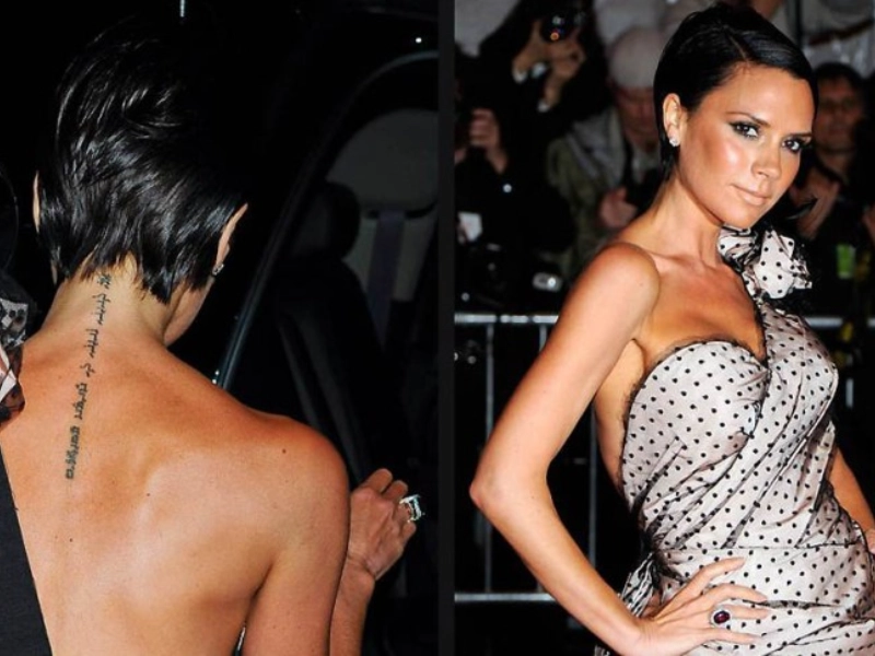 Victoria Beckham’s Hebrew tattoo—“I am my beloved’s, and my beloved is mine”—encircles her neck as a timeless tribute to her marriage and family. It’s a constant, elegant reminder of commitment and devotion.