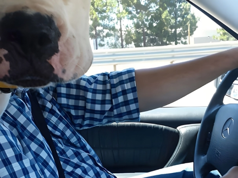 Either this dog is in driver training or chauffeuring his human. What other skills does he hide? The outfit even matches his eyes. That is the exact face we make in traffic.