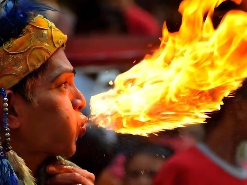This appears largely luck-based. Fire breathers create effects by spitting flammable liquid over flames, making this dangerous performance especially remarkable.