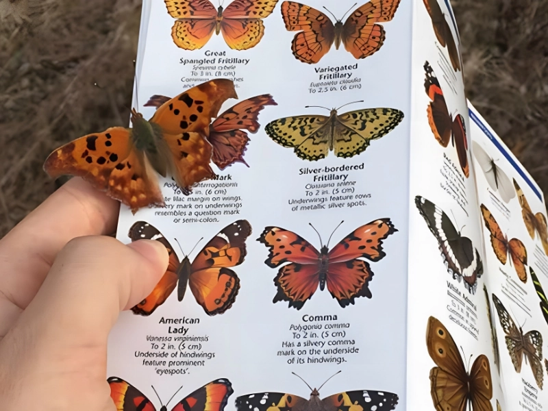 A beautiful "Question Mark" butterfly landed on a book page featuring its species during reading. Perhaps it mistook the image for a companion.